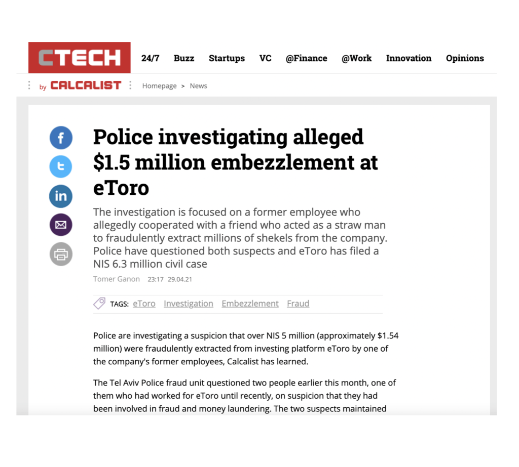 The suspicions and evidence against the two were discovered during an internal investigation conducted by the Wizman Yaar investigation company, hired by eToro. The social investing network began the inquiry in September 2020 when it suspected that millions of shekels had been stolen from it.