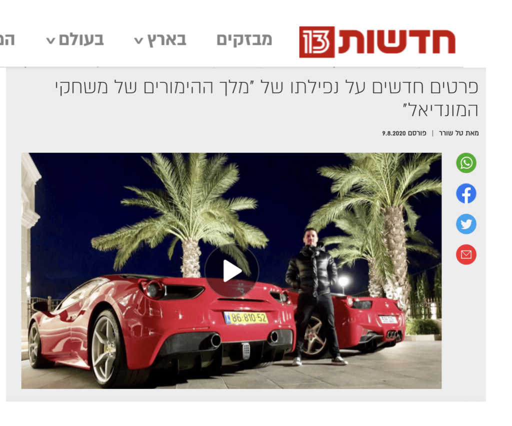 The life of former soccer player , Shai Siboni, also known as the “king of World Cup betting”, was filled with a Ferrari car, luxury watches and jewelry.