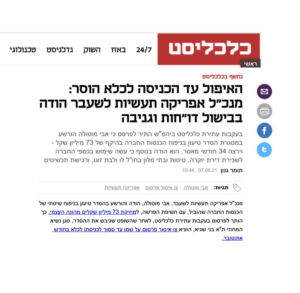 מנכ"ל אפריקה תעשיות לשעבר, אבי מוטולה, הודה והורשע בהסדר טיעון בניפוח שיטתי של הכנסות החברה שהוביל, עם חשיפת הפרשה, למחיקת 73 מיליון שקלים מהונה העצמי. כך הותר לפרסום בעקבות עתירת כלכליסט, לאחר שהשופט שגיבש את ההסדר, סגן נשיא המחוזי ת"א בני שגיא, הוציא צו איסור פרסום על שמו עד סמוך לכניסתו לכלא בחודש אוקטובר.