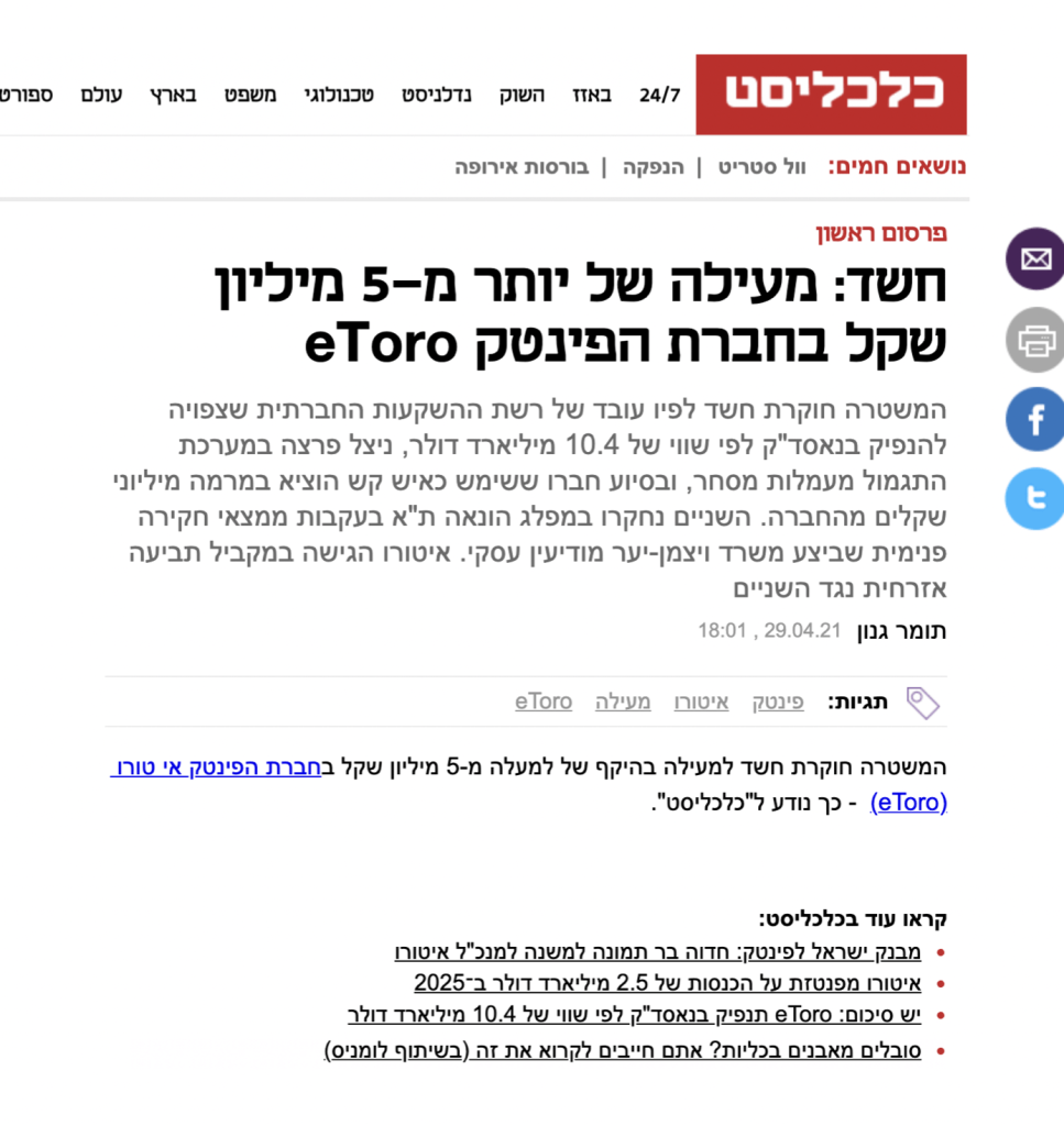 המשטרה חוקרת חשד לפיו עובד של רשת ההשקעות החברתית שצפויה להנפיק בנאסד"ק לפי שווי של 10.4 מיליארד דולר, ניצל פרצה במערכת התגמול מעמלות מסחר, ובסיוע חברו ששימש כאיש קש הוציא במרמה מיליוני שקלים מהחברה. השניים נחקרו במפלג הונאה ת"א בעקבות ממצאי חקירה פנימית שביצע משרד ויצמן-יער מודיעין עסקי